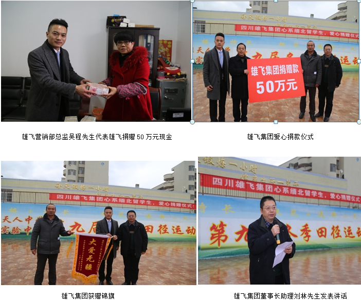 四川雄飞集团二十年来在董事长吴雄飞先生的带领下,一如既往的秉承“发展实业、造福大众、回报社会”的企业宗旨,切实履行企业的社会职责,积极参与光彩事业活动,济世扶贫,助学扶弱,捐资捐款近5000万元人民币,获得四川省慈善总会、工商联、民政厅、国资委联合颁发的四川省“十佳”慈善企业荣誉称号,公司董事长多次荣获自贡市光彩事业促进会颁发的 “光彩之星”称号。